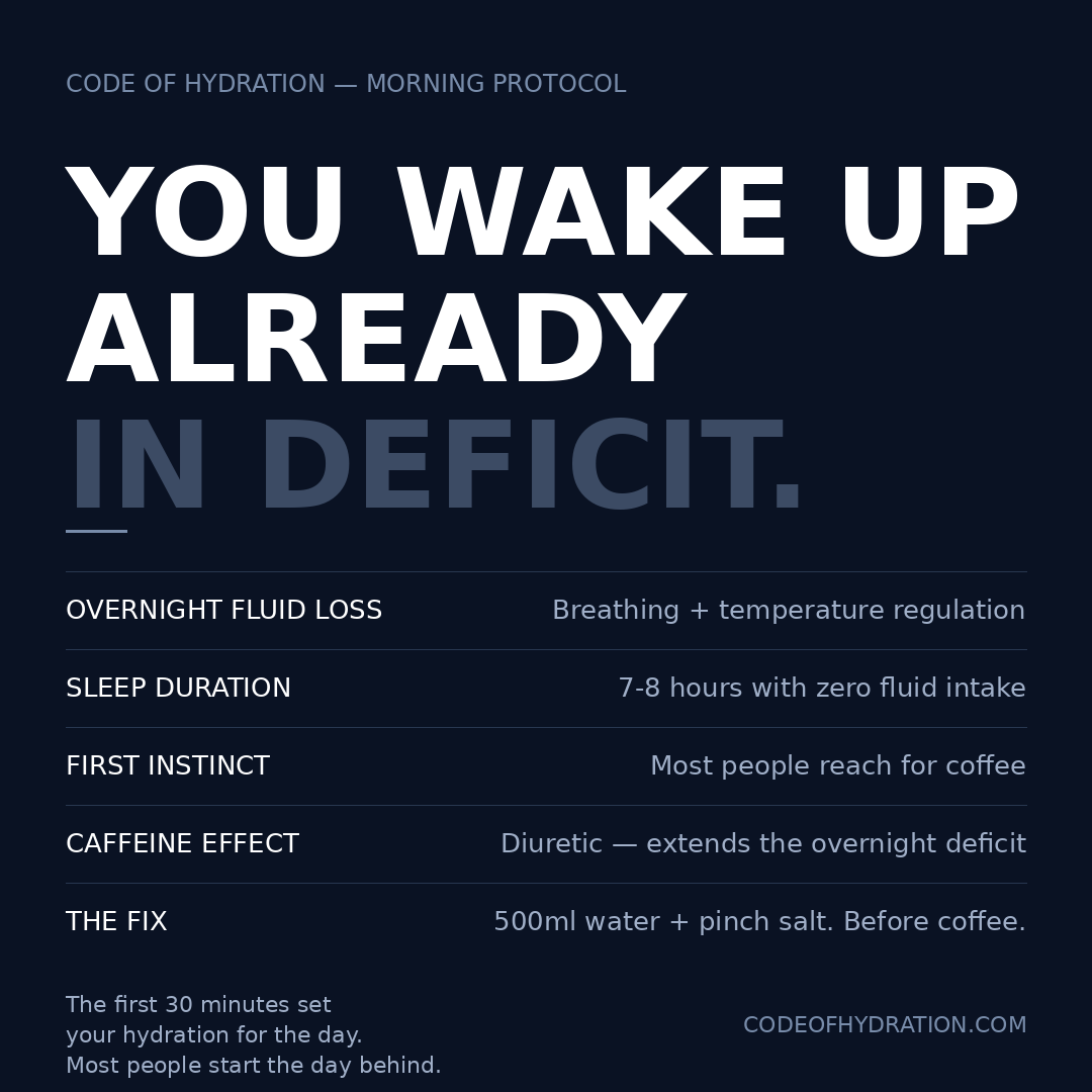 On waking: 400–500ml before coffee or food. Your body is 6–8 hours into a fast and has lost fluid overnight through breathing and skin. This is your highest-return hydration window of the day.